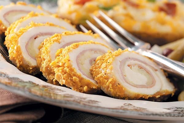 کوردن بلو چیست؟ این لغت در زبان فرانسه به معنی روبان آبی است. حالا روبان آبی یعنی چه؟ کاری به تاریخچه آن نداریم که به زمان شوالیه ها برمیگردد. امروزه یعنی غذایی با کیفیت بالا. البته چیکن کوردن بلو اسم نوعی غذا با مرغ است که به صورت مرحله به مرحله طرز تهیه اش را توضیح داده ایم. اما حالا که میدانید کوردن بلو چیست برویم سراغ کوردن بلو رول شده. در این نوع، پنیر و ژامبون ورقه ای روی سینه مرغ قرار گرفته و با آن رول میشوند. سپس کوردن بلوی رول شده باید مدتی در فریزر قرار بگیرد تا هنگام سرخ شدن شکل رولی اش را از دست ندهد. بعد از این مدت رول مرغ آماده است که با آرد سوخاری کاور و سرخ شود.