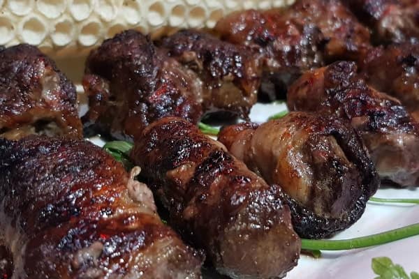 6. هر سیخ جگر را روی تکه ای از وز قرار دهید و آن را به خوبی در وز بپیچید و بعد بر روی آتش با حرارت ملایم کباب کنید(دقت کنید آتش زبانه نداشته باشد چرا که در این صورت جگر به سرعت می سوزد و سفت می شود)