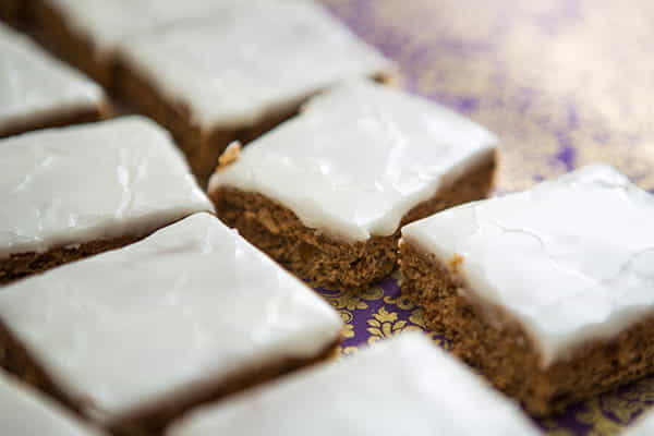 در کاسه ی متوسط، پودر قند و وانیل را با آب به مقدار لازم هم بزنید تا مایع رقیقی به دست آید که قابل پخش شدن باشد. سس را روی شیرینی نسبتا گرم بریزید و اجازه دهید کاملا خنک شود. اگر شیرینی مربعی است، شیرینی را با کاغذ روغنی روی تخته برش قرار دهید .و ببرید. ابتدا آن ها با 8 برش طولی و آن را به 6 برش تقسیم کنید.