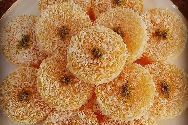 ۷- داخل ظرفی (پیش دستی) پودر نارگیل بریزید و لوکوم های پرتقالی تکه شده را داخل آن بغلتانید.