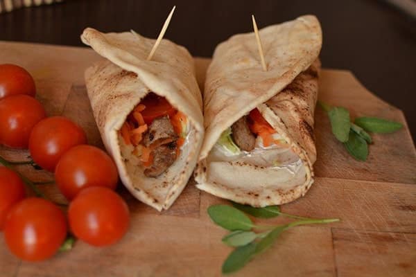 ساندویچ شاورما گوشت را رول کنید و به کمک یک یا چند خلال دندان نان پیتای آن را محکم کنید. نوش جان.