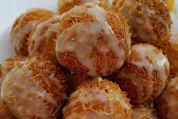 6- یک تابه کوچک آورده و رغن مایع را داخل آن بریزید. وقتی کاملا داغ شد توپک های آماده شده را داخل آن سرخ کنید. وقتی همه توپک های پنیر و شعریه را سرخ کردید شیر عسلی را روی آن ها ریخته و سرو کنید.
